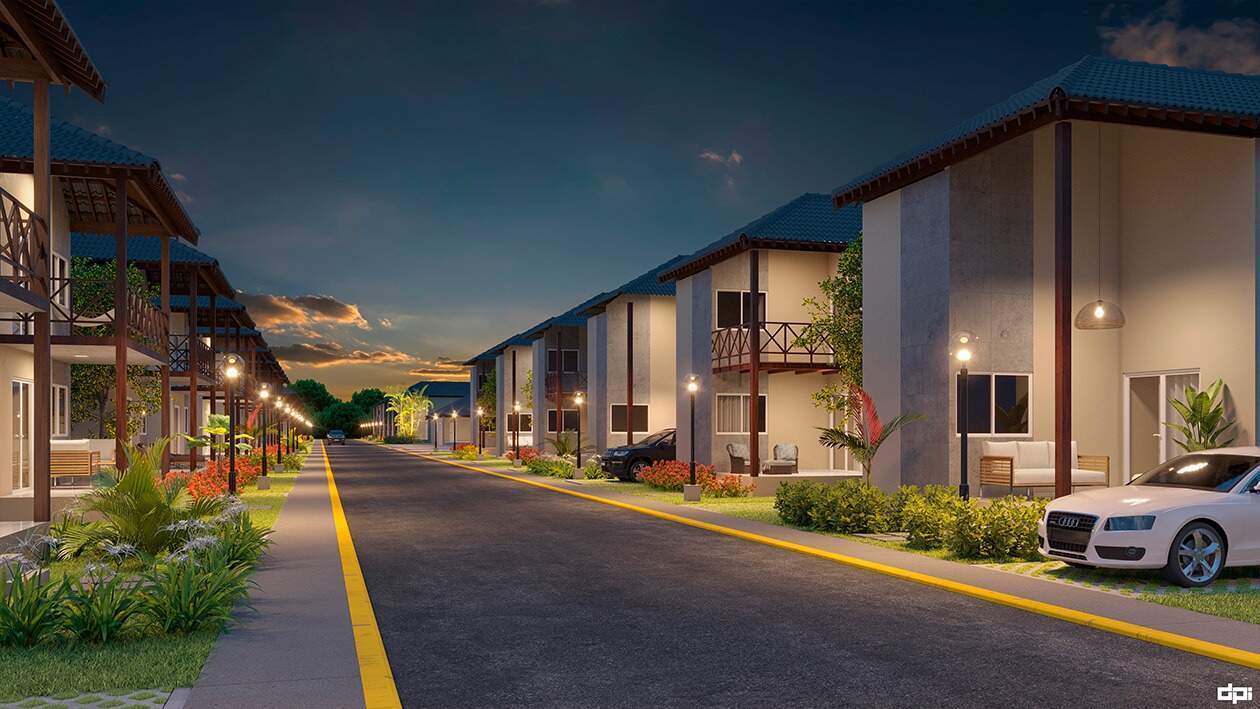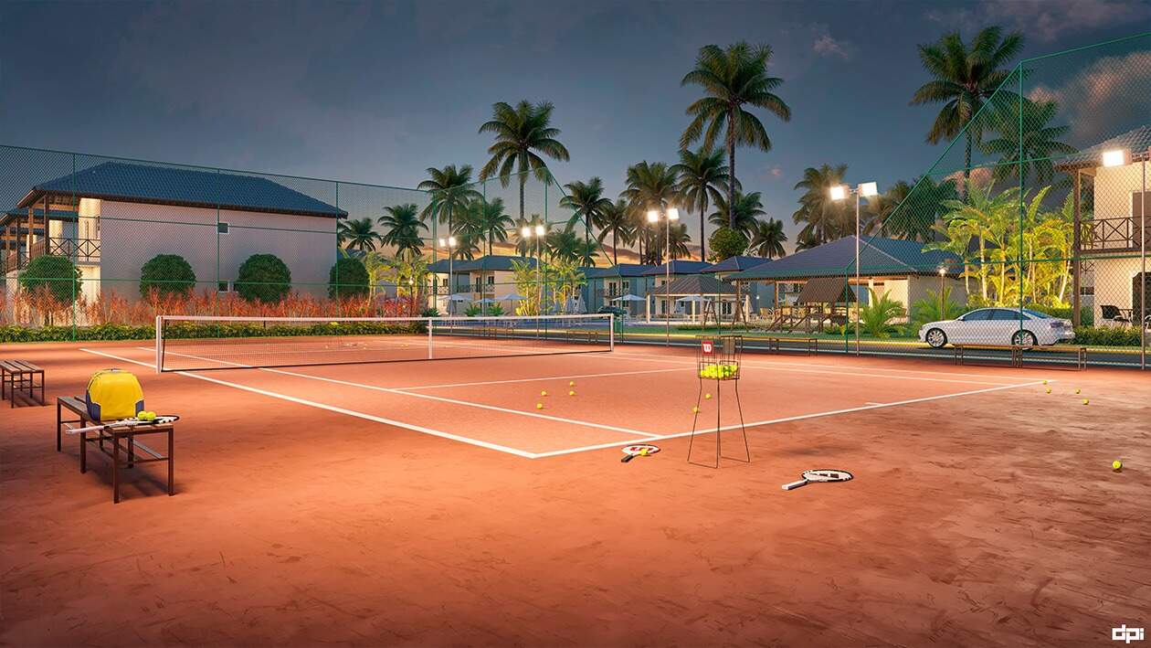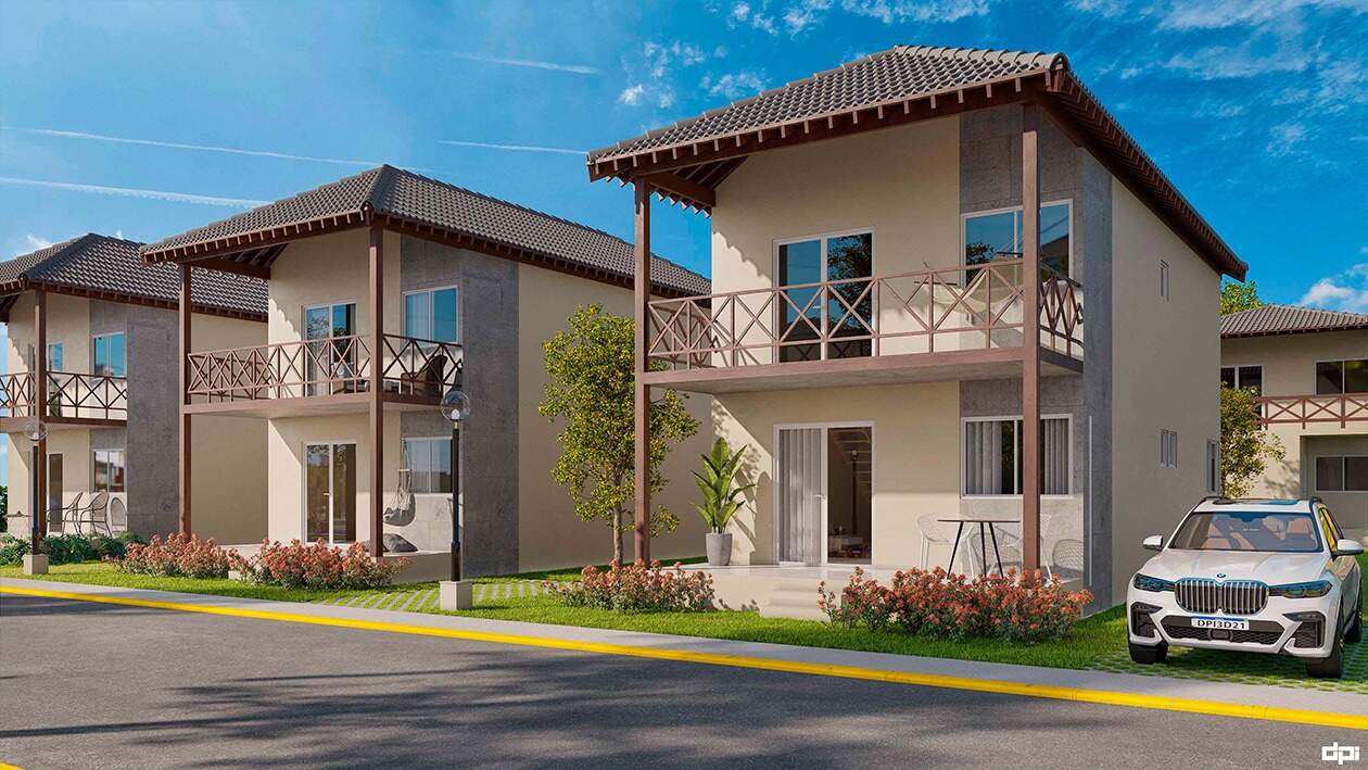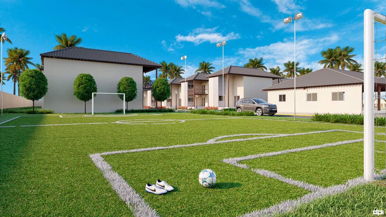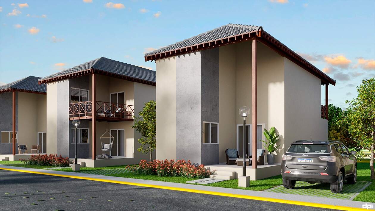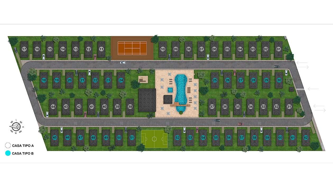 O empreendimento é composto por 62 casas, cada uma delas com 3 quartos, sendo 2 suítes, 01 WC social, sala, cozinha, terraço inferior, varanda superior, mezanino e área de serviço. Todas as casas são soltas não conjugadas, possuindo um terreno na lateral com 5,00m de largura, onde existe espaço para estacionamento de até 04 carros e opção de planta para 4 quartos suítes. Área de lazer ampla e completa Salão de festas e de jogos, piscina adulto e infantil, piscina jacuzzi aquecida, sauna, pista de cooper, playground, quadra de tênis, campo de futebol. Opção para 04 quartos suítes - Terraço - Varanda.