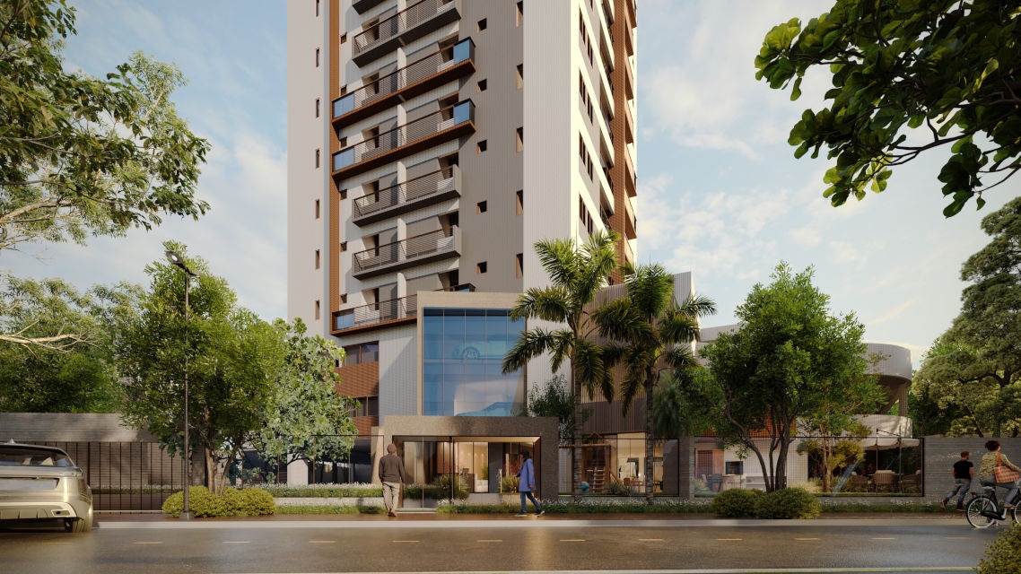 29 pavimentos, sendo 01 pavimento térreo, 01 pavimento "vazado 1", 01 pavimento "vazado 2", 25 pavimentos tipo elevado com 04 apartamentos por andar e 01 pavimento de coberta do edifício.