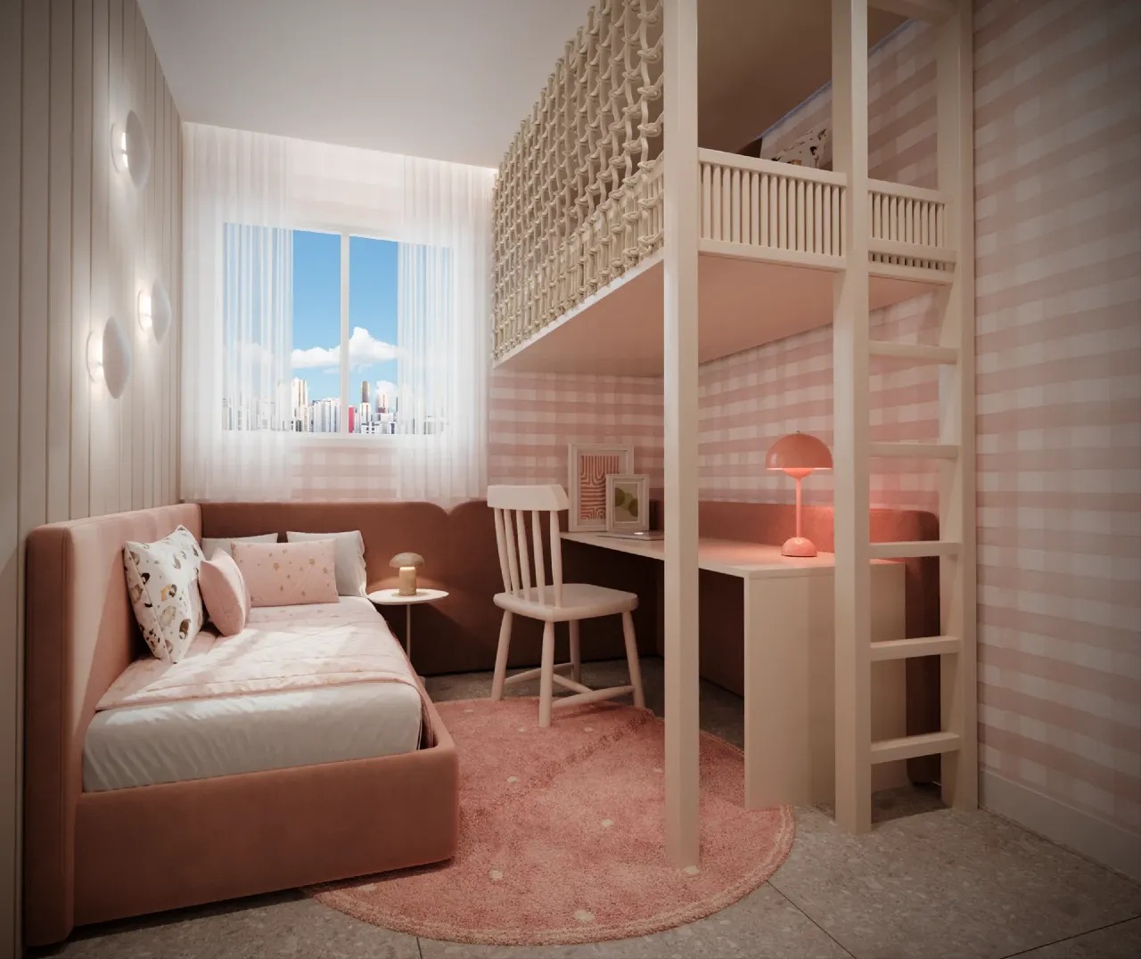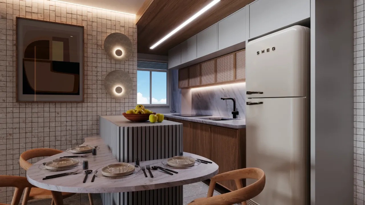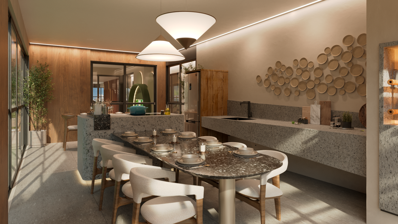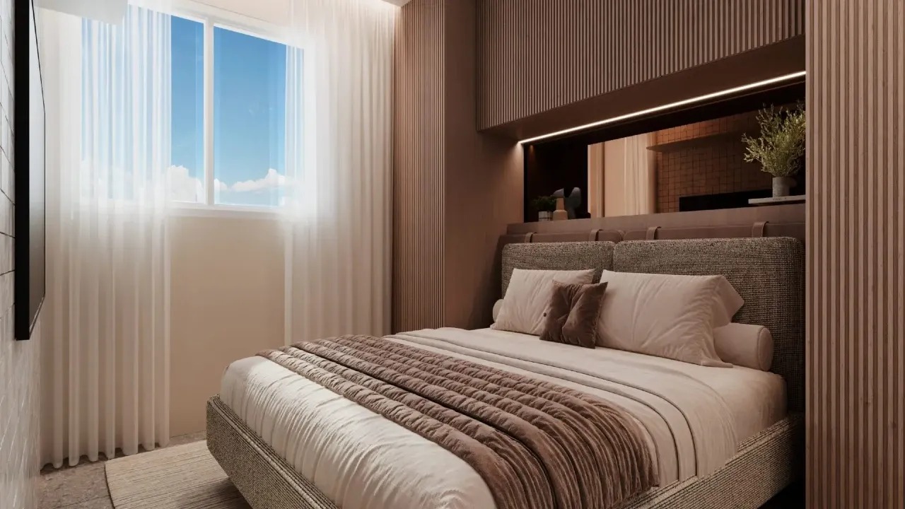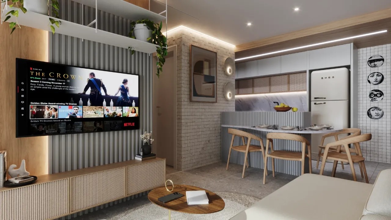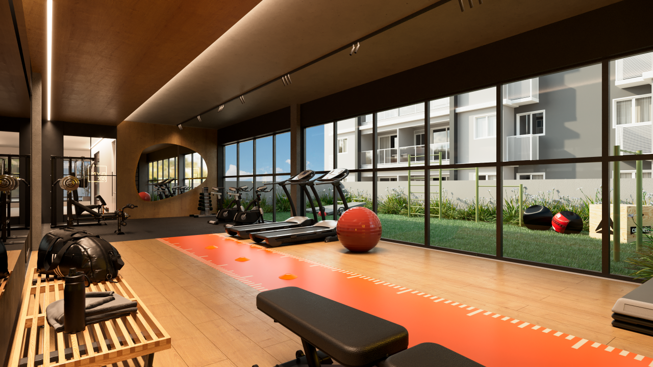 Demais unidades possuem 02 quartos, sendo 01 suíte, varanda gourmet com peitoril em vidro, sala para 02 ambientes, WC social, cozinha integrada ao living, área de serviço, preparação para aquecimento a gás nos chuveiros e tomada USB na suíte.