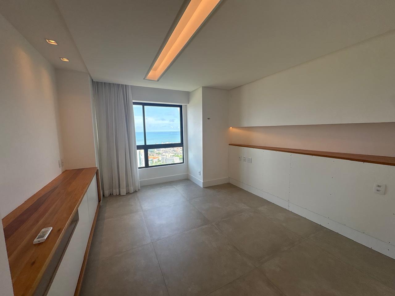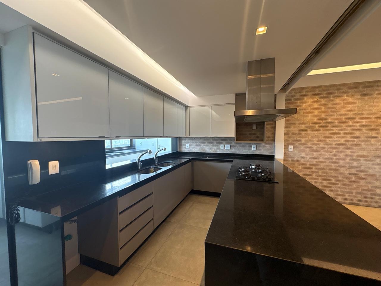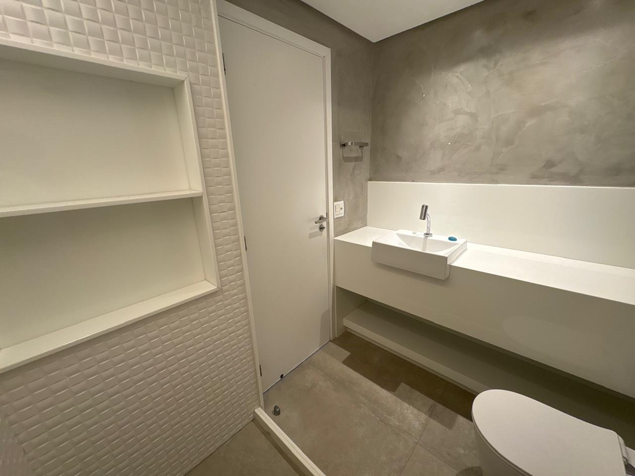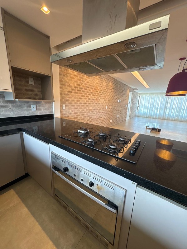 Piso em porcelanato em todos os ambientes. Sala ampla, com papel de parede, iluminação led, embutida em forro de gesso e painel planejado. Cozinha integrada com bancada, cooktop e iluminação instalada. Área de serviço equipada com banheiro de dependência.