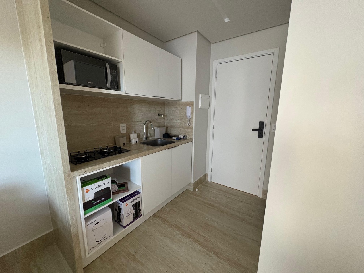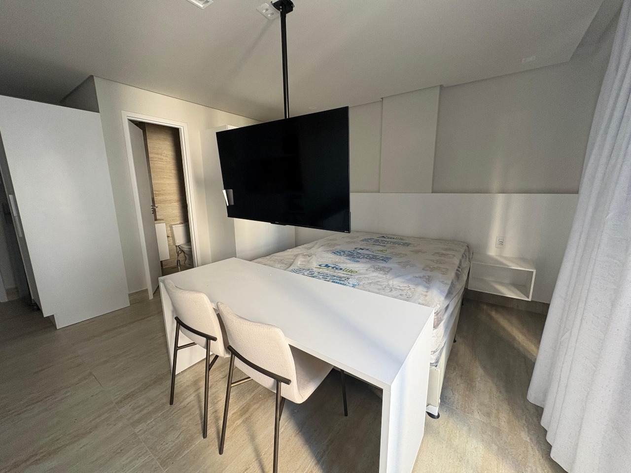 Studio mobiliado, com diferencial de uma ampla varanda para receber amigos ou fazer um jantar.