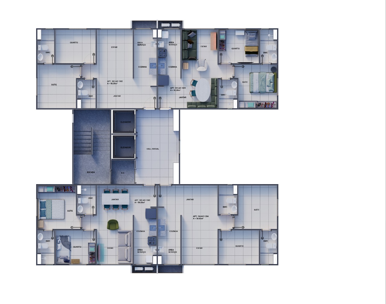 Apartamentos com 2 quartos (1suite) distribuídos em 50m².