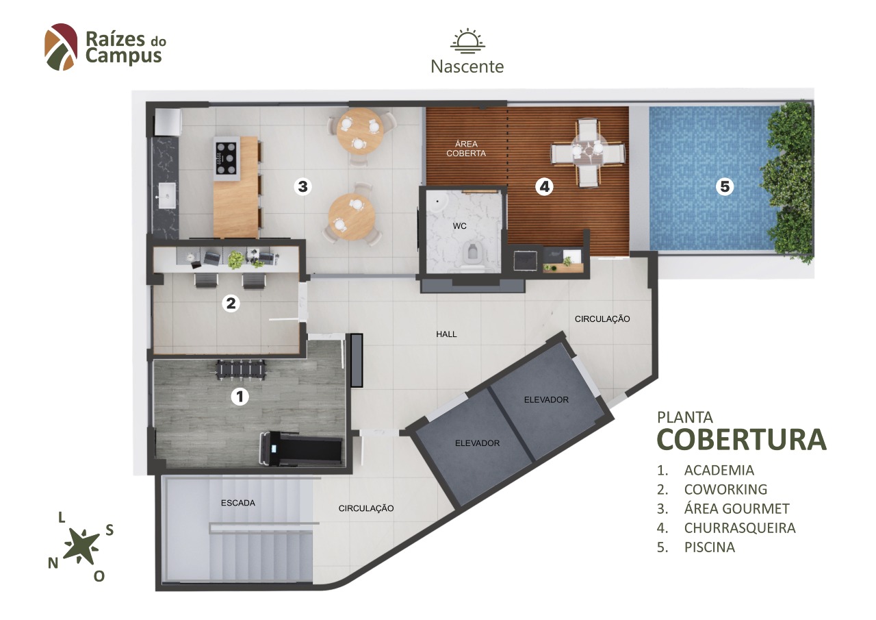 O Raízes do Campus reúne comodidades que se tornaram indispensáveis nos empreendimentos modernos, como espaço de Coworking, lavanderia compartilhada, área para pets, Rooftop com piscina, academia equipada, espaço gourmet e bicicletário distribuídos ao longo de seus 12 andares e 18 unidades de vagas de estacionamento rotativas.