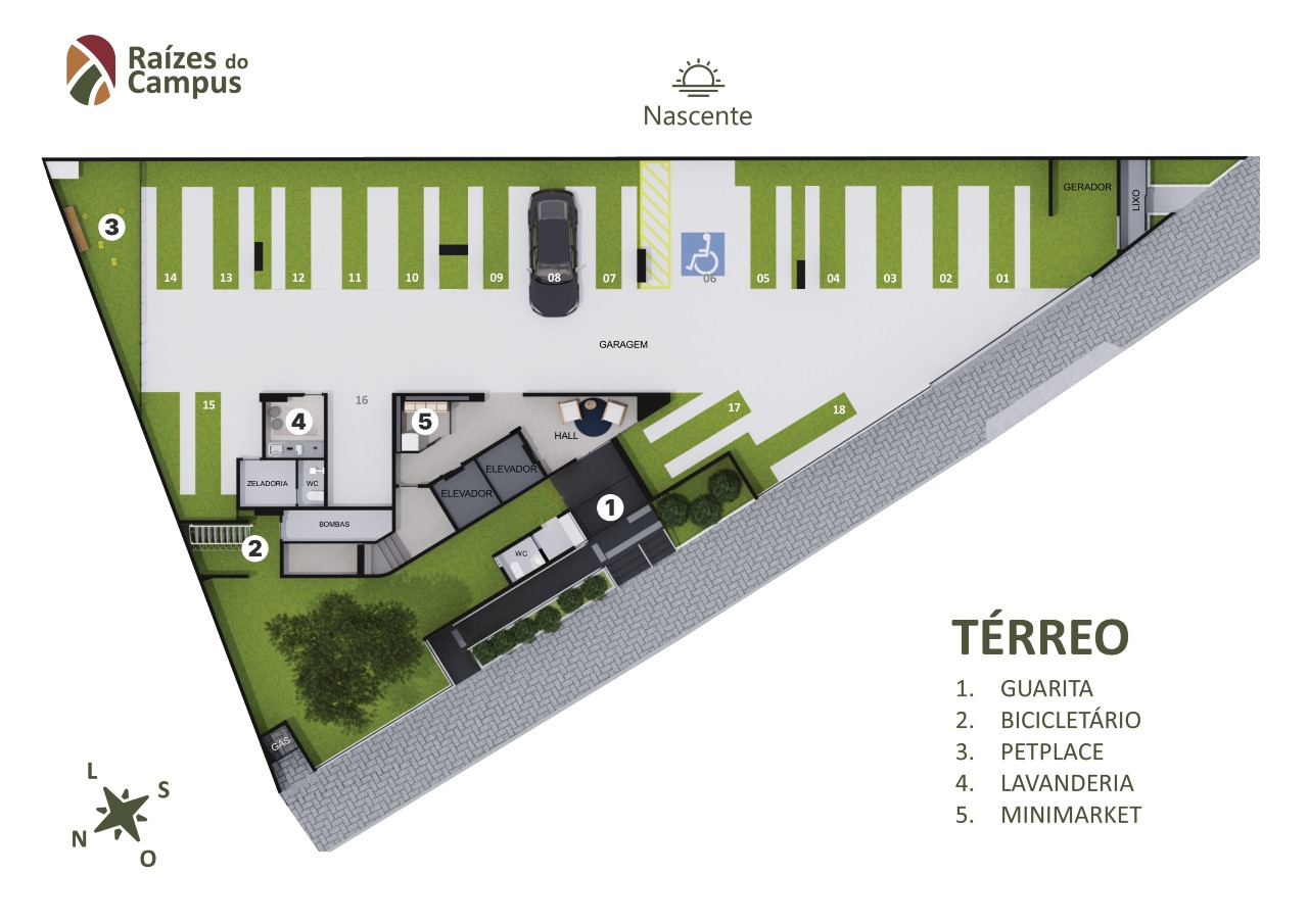 O Raízes do Campus reúne comodidades que se tornaram indispensáveis nos empreendimentos modernos, como espaço de Coworking, lavanderia compartilhada, área para pets, Rooftop com piscina, academia equipada, espaço gourmet e bicicletário distribuídos ao longo de seus 12 andares e 18 unidades de vagas de estacionamento rotativas.
