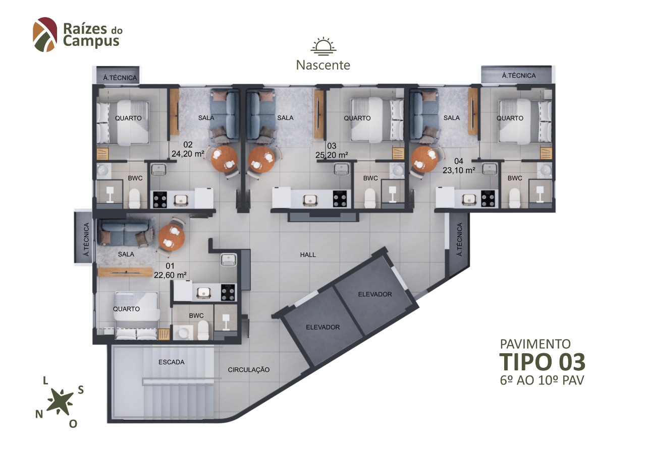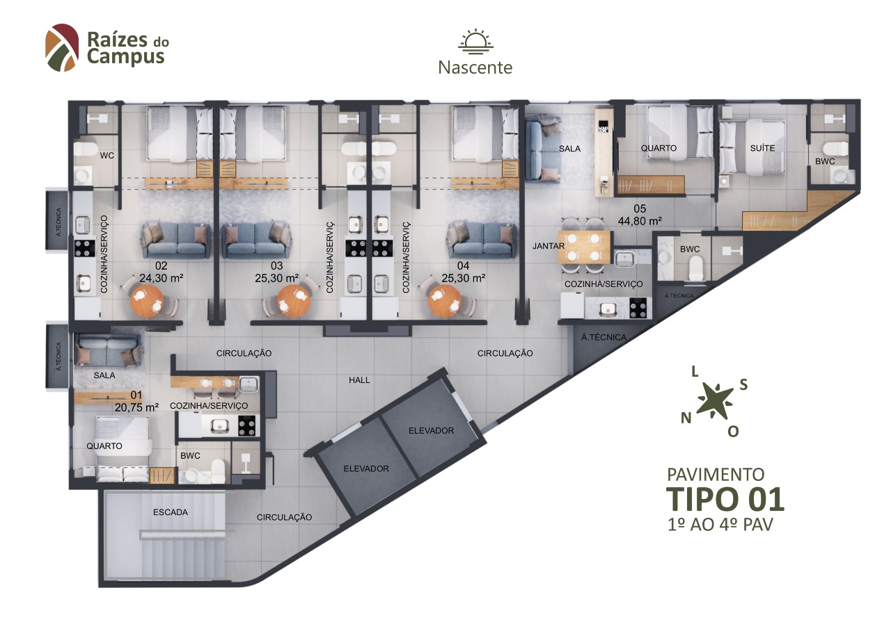 Com unidades que variam de 20,75m² a 44,80m², o Raízes do Campus é perfeito para quem busca praticidade seja para investir com segurança ou morar com conforto.