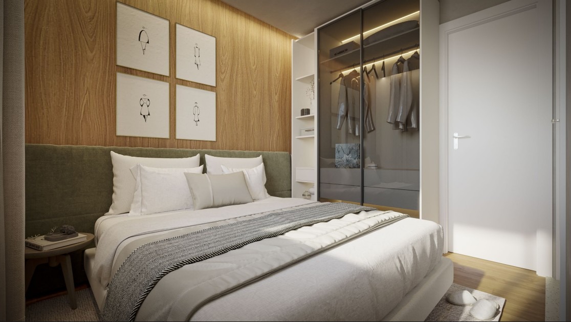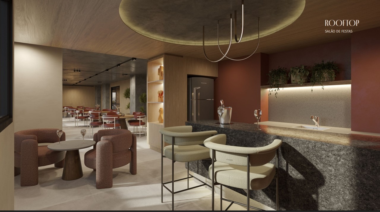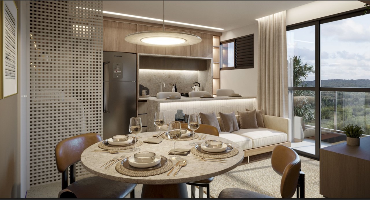 Apartamentos de 2 quartos com 1 suíte, com varanda, sala para 2 ambientes , cozinha integrada ao livinhg, área. Com metragem que varia de 45,46m² a 52,28m².